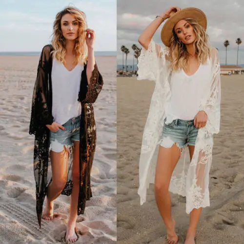 Women Lace Kimono Blouse Boho Casual Long Sleeve Cardigan Beach Cover Up Long Tops Lace Beachwear