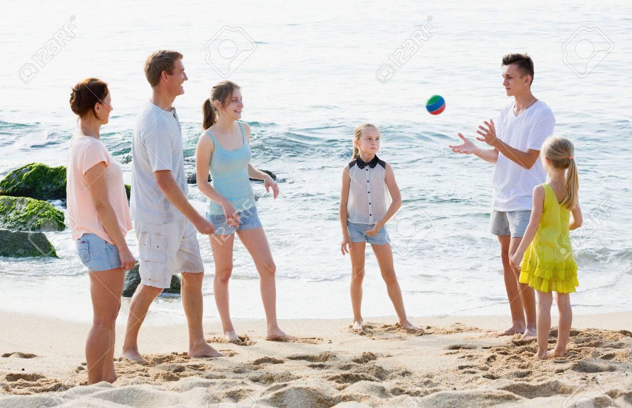 Large Smiling Family Of Six People Playing Active Games On Beach