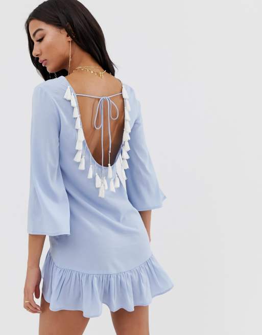 Boohoo Beach Dress With Low Back And Tassel Trim In Blue